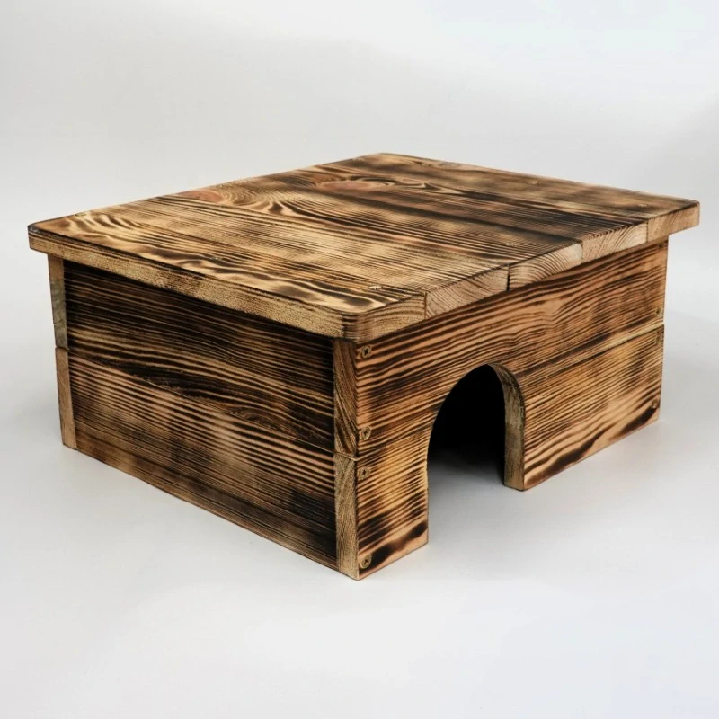 - Domeček je vyroben z masivního (plného) dřeva, což zaručuje jeho bezpečnost pro okusování mazlíčky.